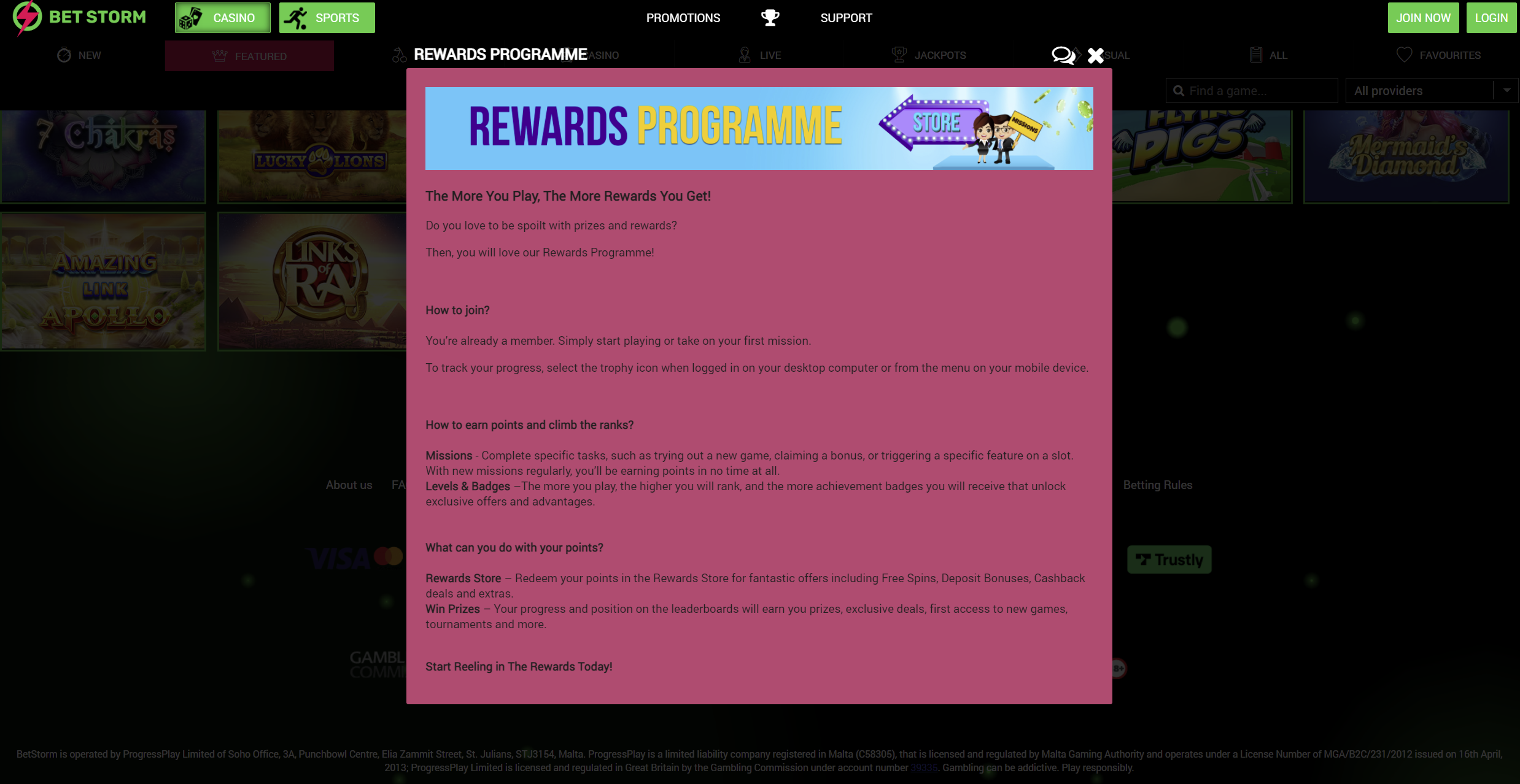 Während BetStorm seinen Ursprung im Online-Wetten hat, haben sie sich in die aufregende Welt der Online-Casinos verzweigt. Sowohl das Sportwetten als auch das Casino werden von ProgressPlay betrieben, wobei dieses Unternehmen seinen Sitz in Malta hat. Zusätzlich zu einer Lizenz bei der Malta Gaming Authority wird BetStorm von der UK Gambling Commission reguliert und lizenziert. Sie können einen Willkommens-Casino-Bonus beanspruchen, um loszulegen.